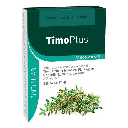 Timoplus Integratore alimentare a base di timo, eucalipto, grindelia, lavanda, lichene, piantaggine e finocchio.L'eucalipto e la grindelia sono noti per i loro effetti balsamici.