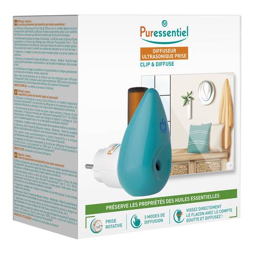 Il Diffusore Ultrasonico a presa Clip & Diffuse è un modello depositato esclusivo Puressentiel che permette la diffusione di oli essenziali grazie a un sistema di diffusione a ultrasuoni che rilascia brevi nebulizzazioni aromatiche.